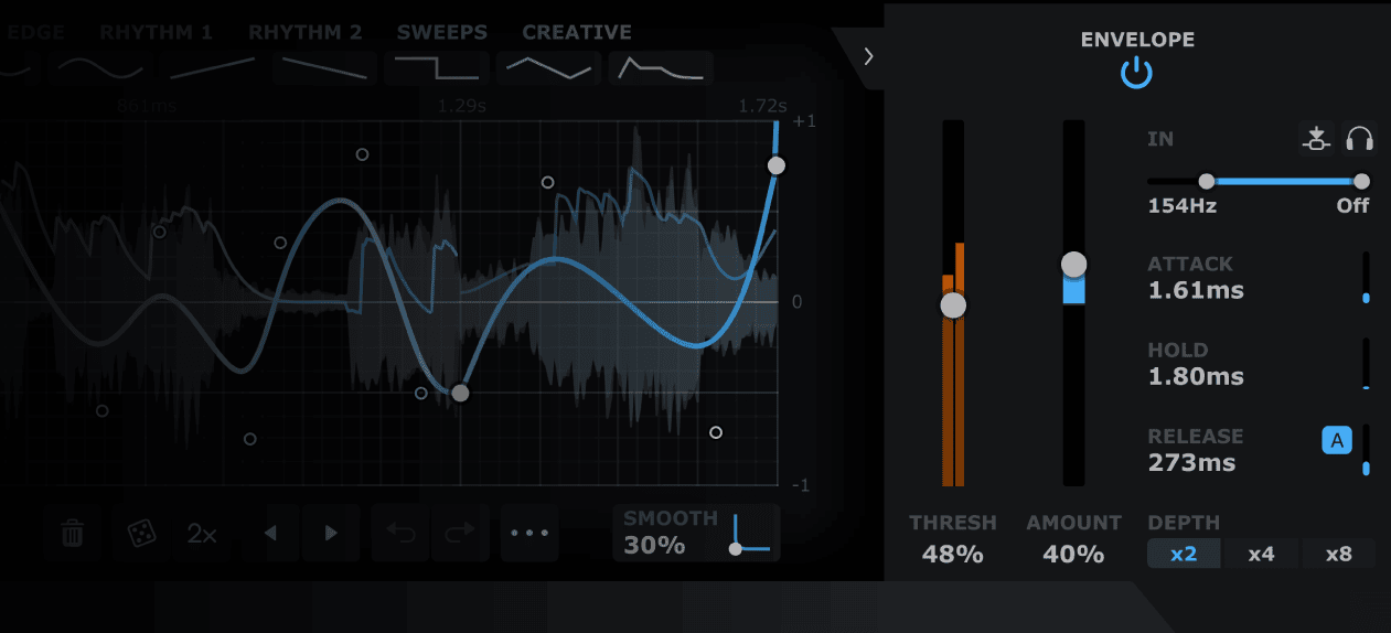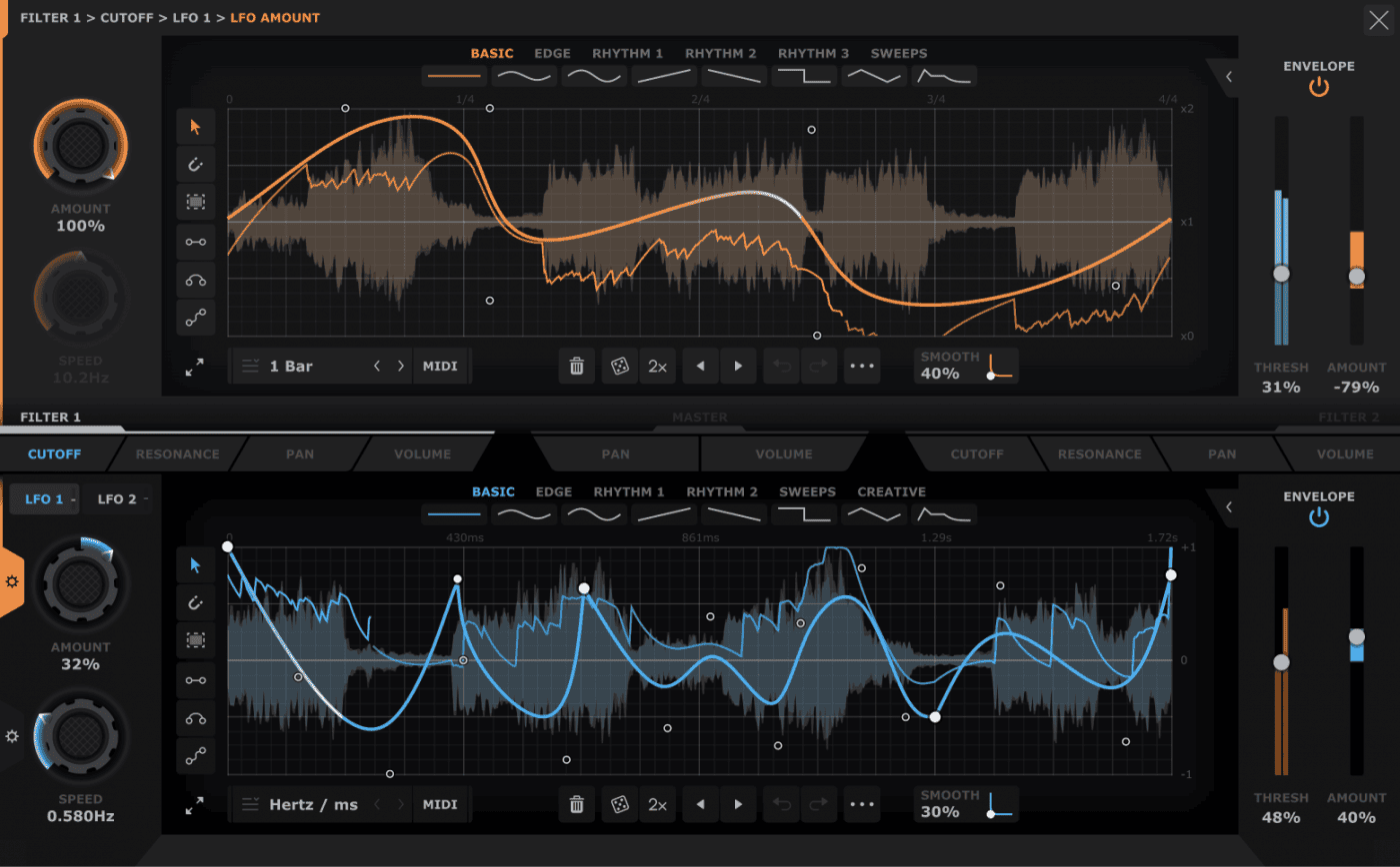 只需单击一个参数(截止、共振、音量或声像),然后开始编辑主 LFO 和包络跟随器。然后使用 LFO 2 随时间上下移动形状。使用专用的 Amount LFO 控制调制本身的深度。并使用 Speed LFO 有节奏地加快和减慢您的模式。