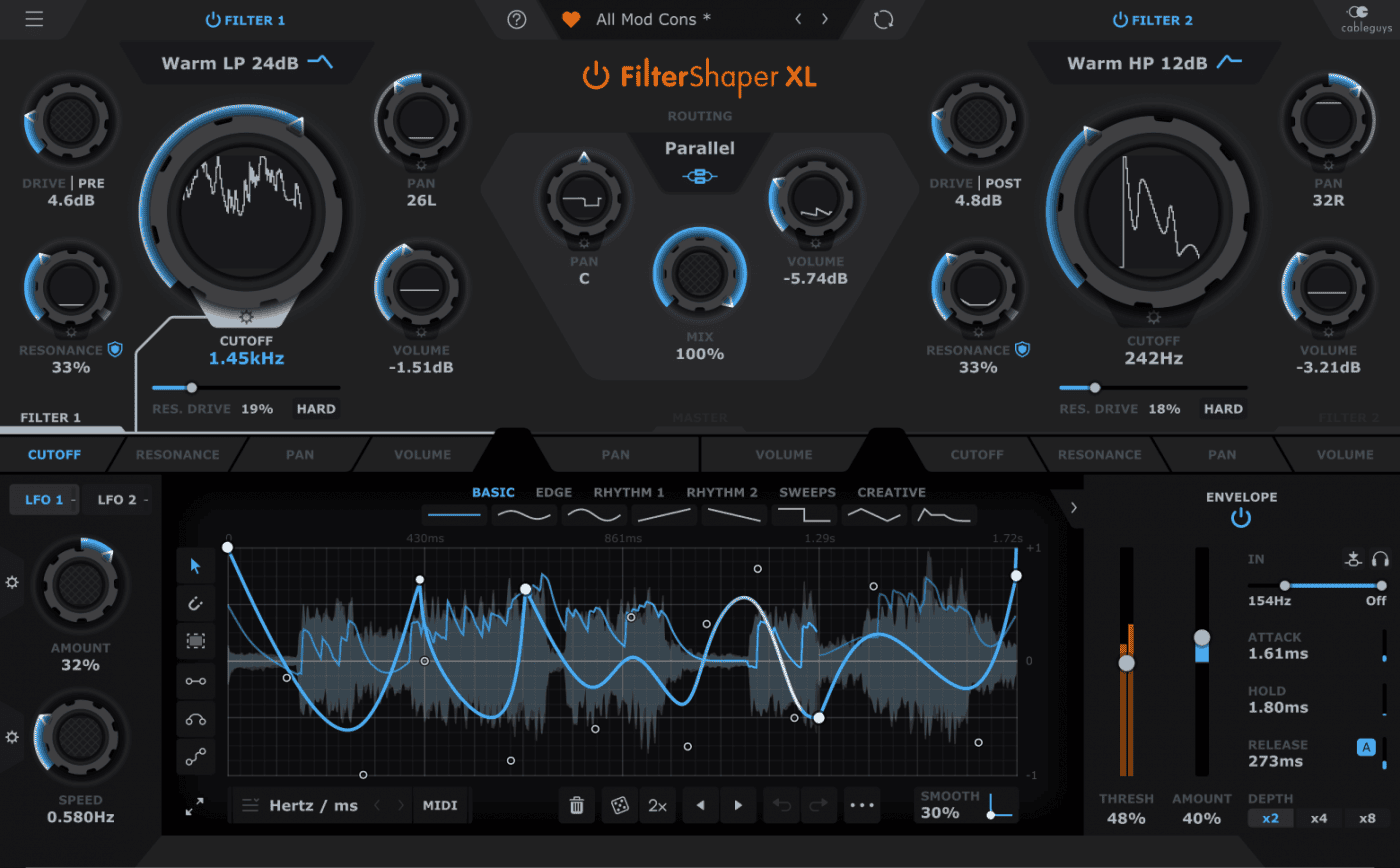 FilterShaper XL 通过两个强大的滤波器、多级驱动器和极其灵活的调制框架,在非常传统的声音设计方面取得了巨大的飞跃。